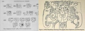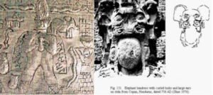 Other examples of elephants can be found in Mayan writing and sculptures, Olmec pottery, and metal plates from as far south as Ecuador.