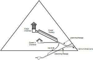 The classical account of the discovery of the upper chambers inside the Great Pyramid at Giza is well known. In the ninth century an Arab governor of Cairo, known as the Caliph al Ma’mun, decided to see for himself what lay inside the Great Pyramid. Because the entrance to the pyramid was concealed and its location unknown, his workers began to excavate a tunnel boldly through the casing and core blocks, with hammers and chisels. Fortuitously for the Caliph, their busy tunnelling shook the structure so much that the capstone fell off the end of the ascending passage. The resonating crash was heard by the workers, who dug in that direction and found not only the descending passage, but also the ascending passage and all the upper chambers in the pyramid. After thousands of years lying undisturbed deep inside the Great pyramid, the King’s and Queen’s chambers were finally open, and their treasure would soon belong to the Caliph.
