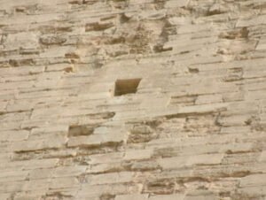 Sir Flinders Petrie backed this quotation up with a detailed study of the entrances to the Vega (Bent) pyramid, the only pyramid that still has the doorways around the entrance intact. He found that on either side of the entrance, there were holes cut opposite each other, about 9cm in diameter by 14cm deep. These holes were just inside the entrance and only 15cm from the top of the passage. Petrie, not unreasonably, interpreted these as being the hinge sockets to swing the stone door from.
