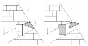 Behind these sockets, the passageway contained more door sockets. These were smaller vertical sockets, for a very lightweight door, perhaps made of wood and presumably to keep out the wind-blown sand. The diagrams below were developed by Petrie, based on his analysis of the Vega (Bent) pyramid entrance. The hinged stone door is clearly marked as the large shaded stone. It needs to be this shape, with a long top extending backwards, in order to counterbalance the weight of the stone. The amount of counterbalance at the top would have been judiciously arranged by the architect, so that the force required to open the stone was within normal human limitations, say about 25kg of force.
